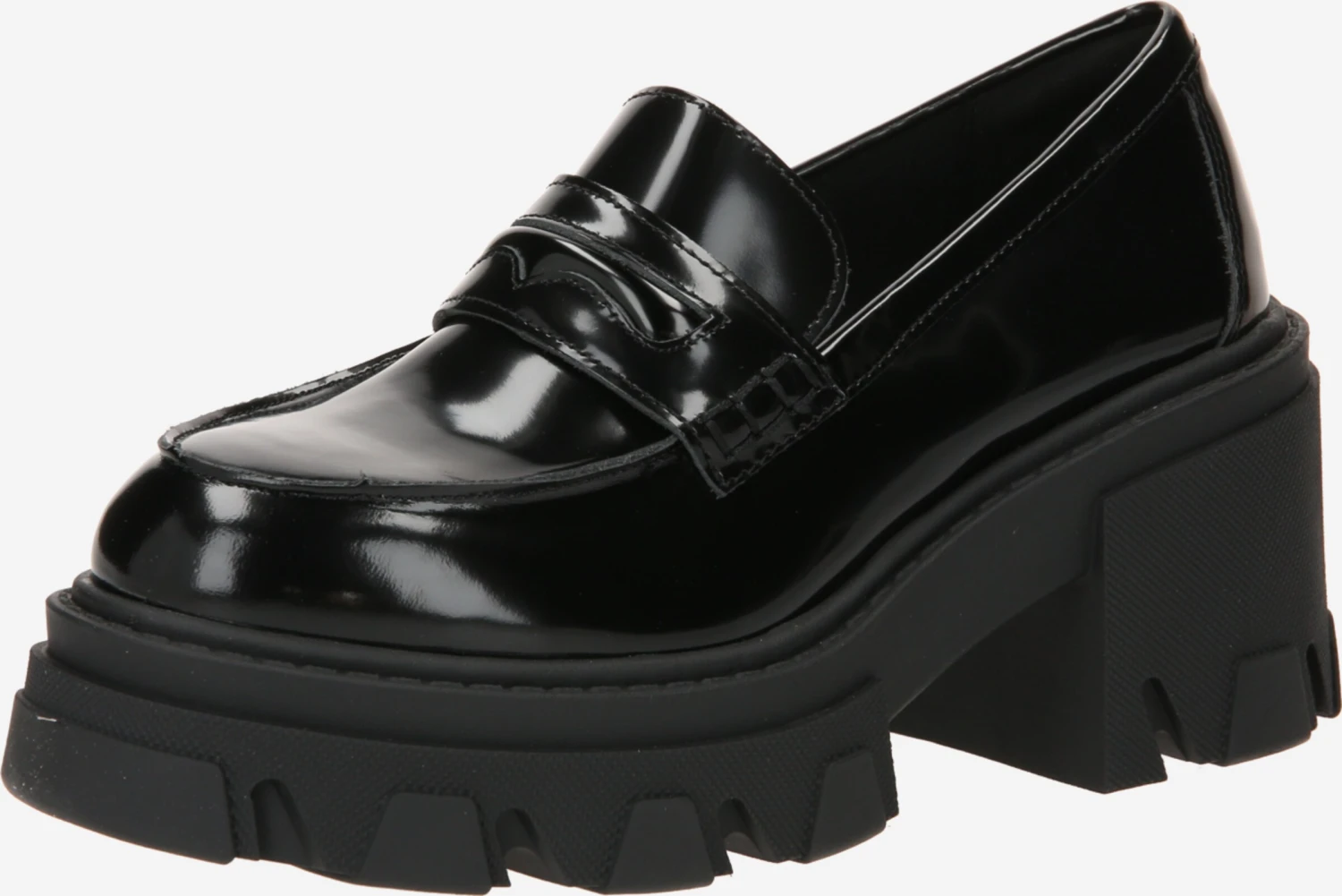 EffenLeerBlokhakMet plateauRonde neusProfielzolenVersterkte hakGlanzendGladde stofStevige stofLakSlip