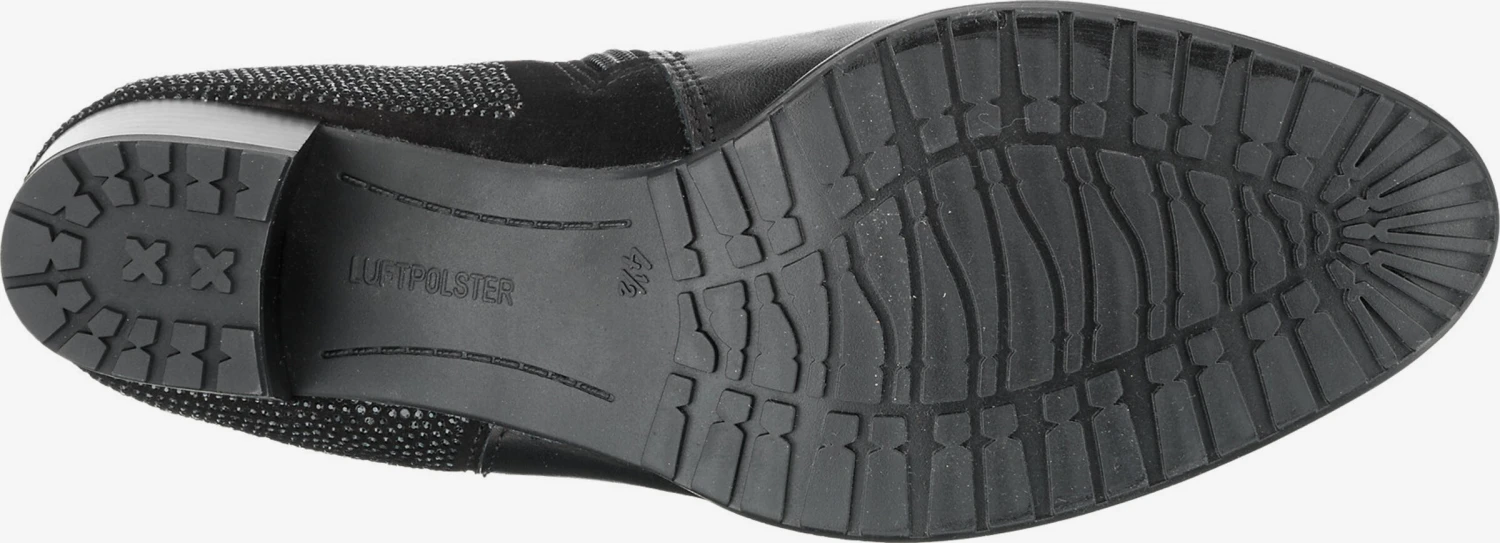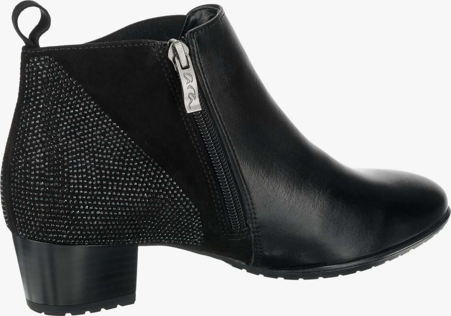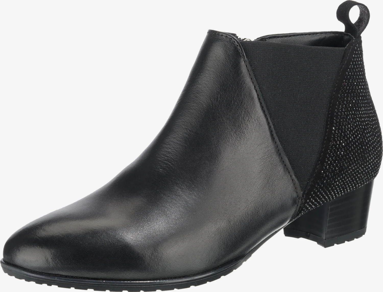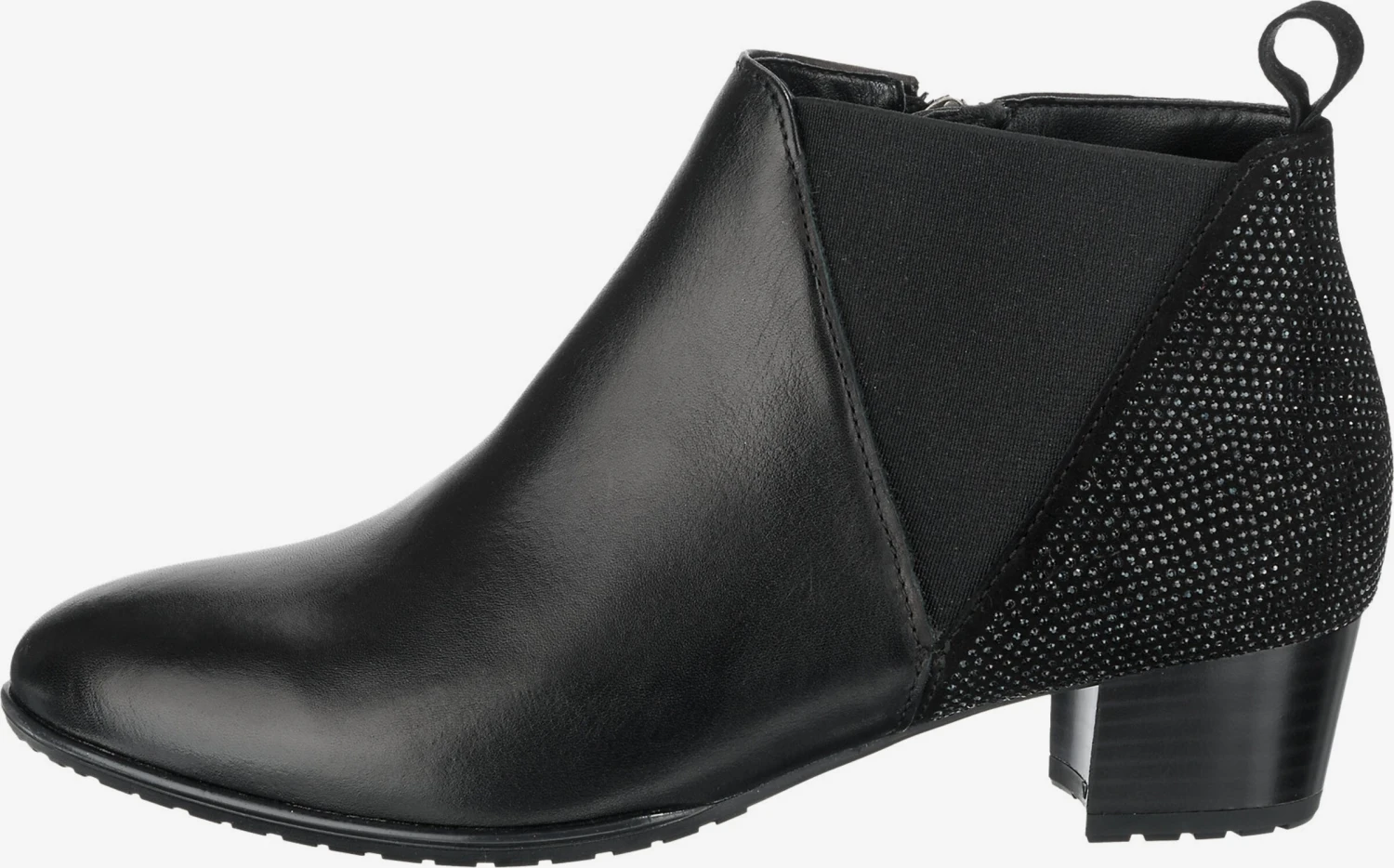 EffenLeerBlokhakRonde neusGevoerdZakken aan de zijkantRitszakken aan de zijkantHak met laagjes lookElastische inzetstukkenProfielzolenVersterkte hakHielbandMet halfedelstenenGlitterendGladde stofAnti-slip zoolFlexibele zoolGlad leer