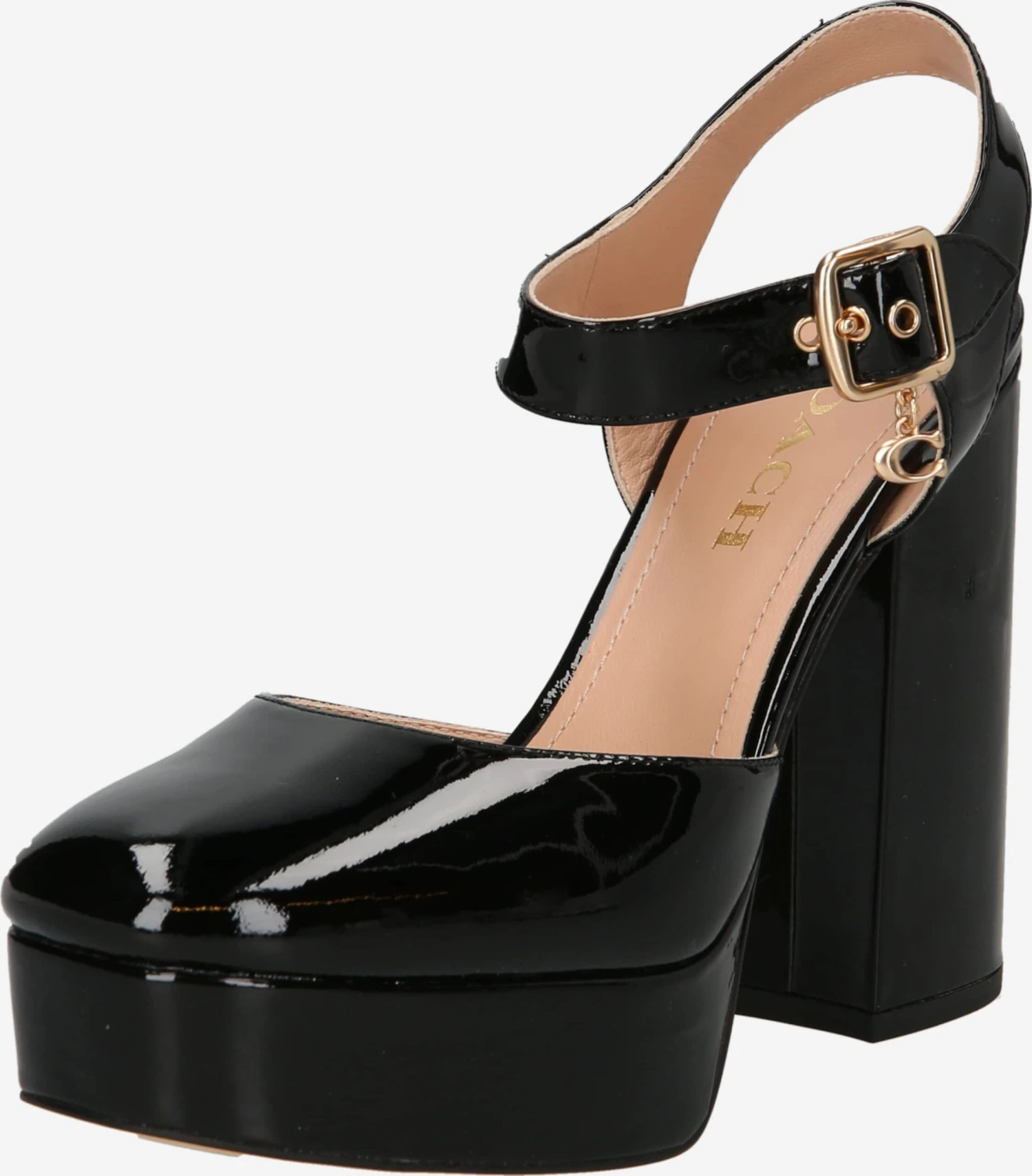EffenLeerBlokhakMet plateauRonde neusPumps met enkelbandjeVerstelbare riemenGlanzendNon-slipLakGesp