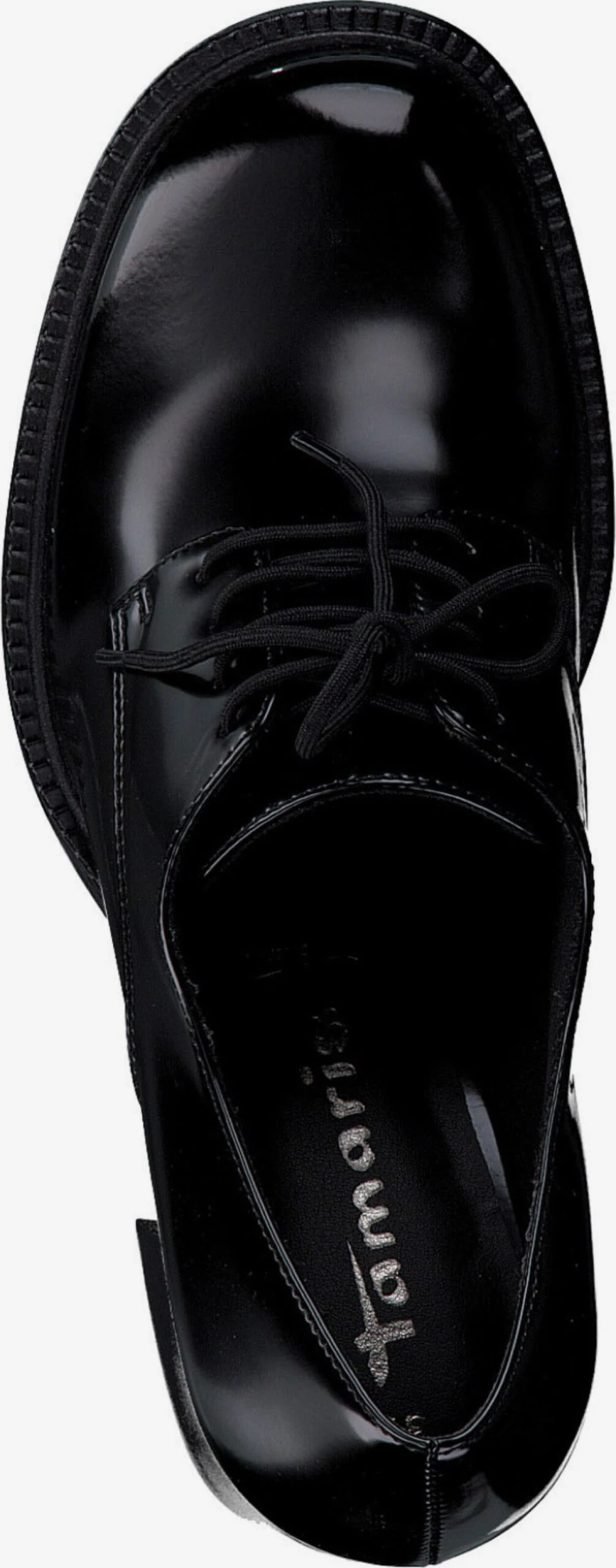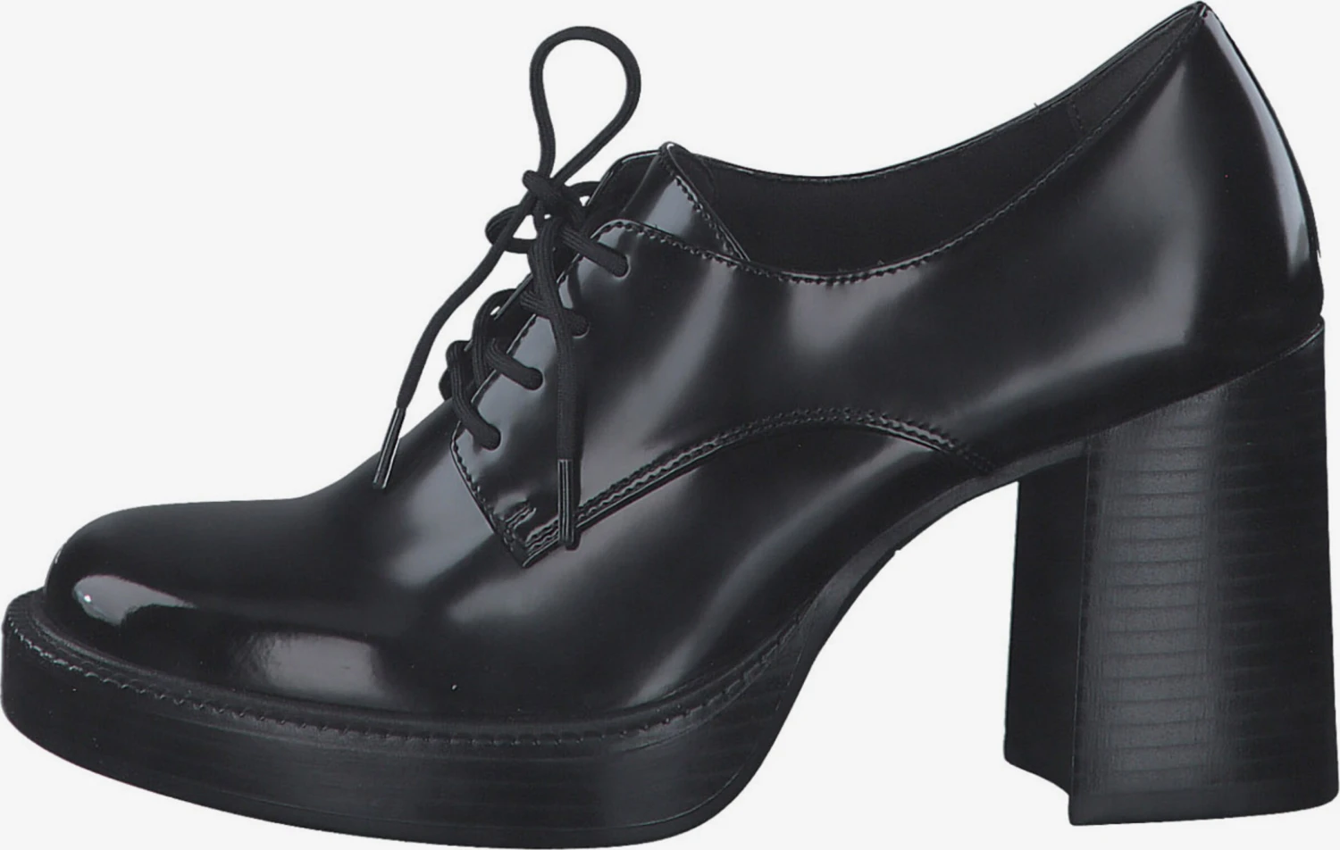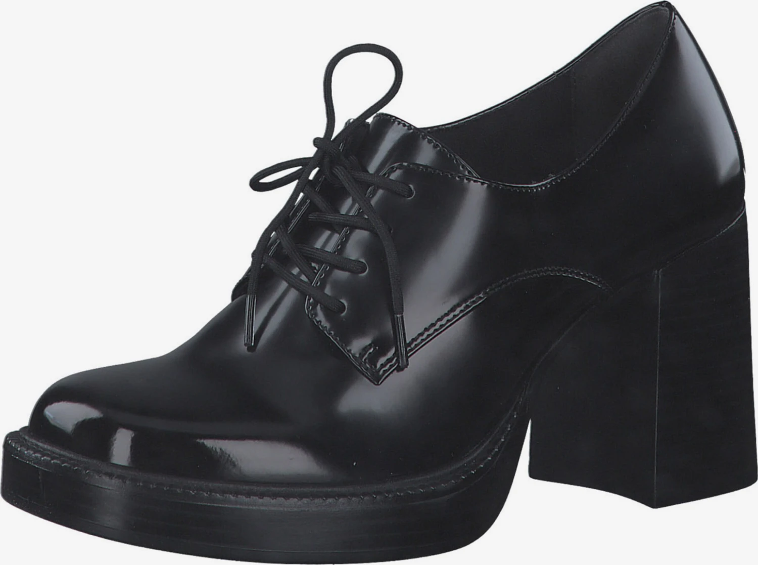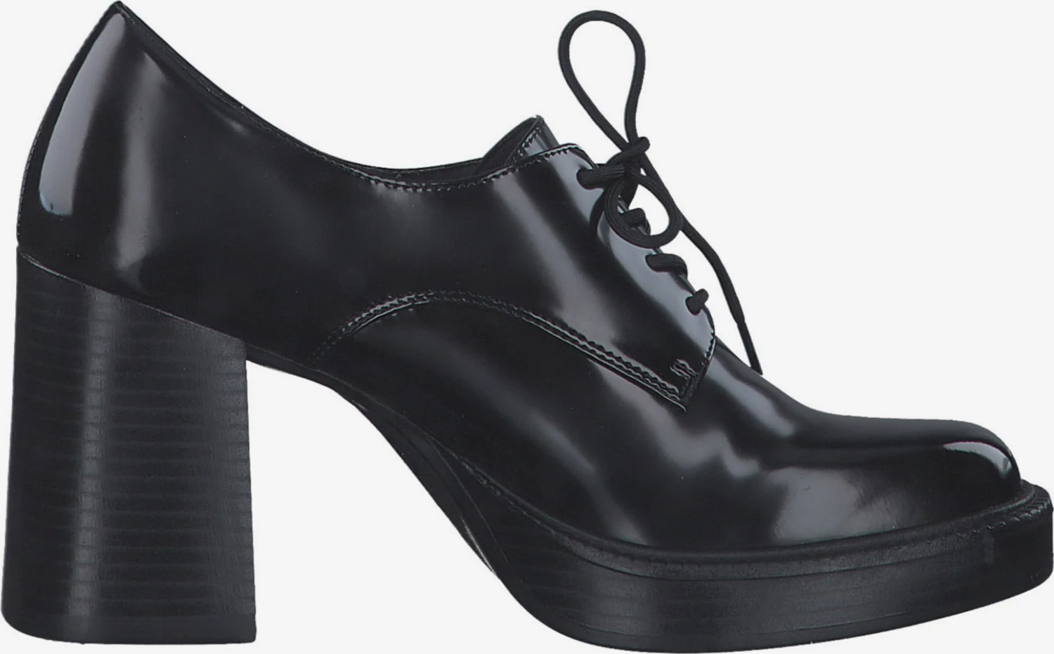 EffenBlokhakMet plateauRonde neusHak met laagjes lookVetering met 4 gatenProfielzolenVersterkte hakGlanzendGladde stofFlexibele zoolImitatieleerSnoersluiting